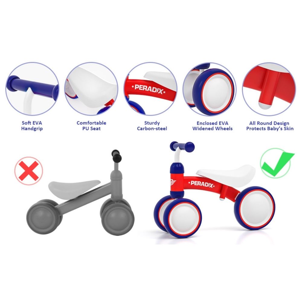 The balance bike adopts a new design, without any exposed bolts that will scratch the baby’s thighs, so quality is guaranteed. 135-degree steering limited to avoid baby side falling, safer than a regular baby balance bike. Peradix baby bike would be the best 1 2 year old birthday gift for boys and girls, babies.